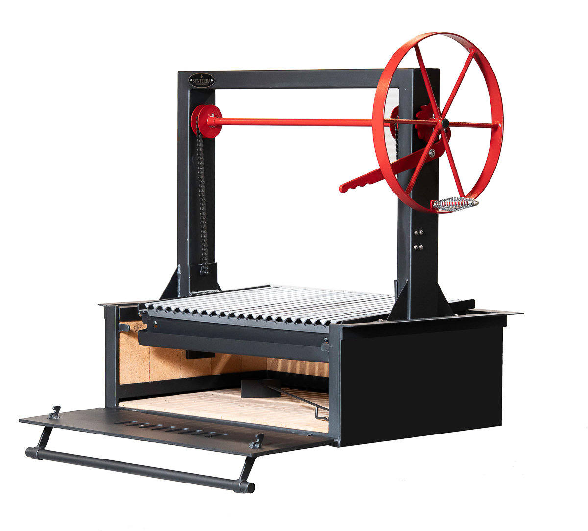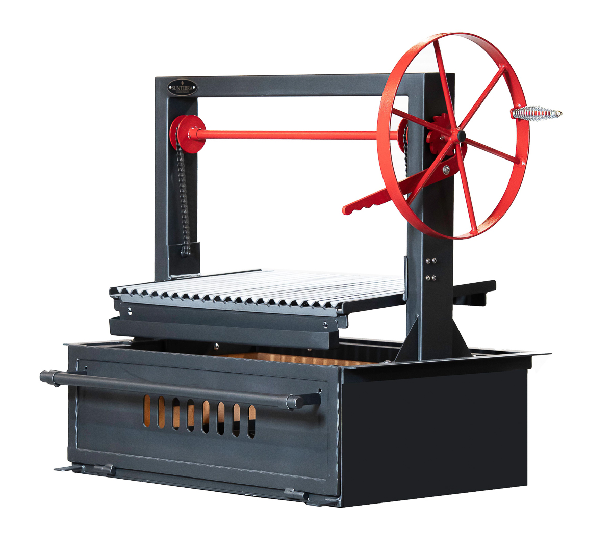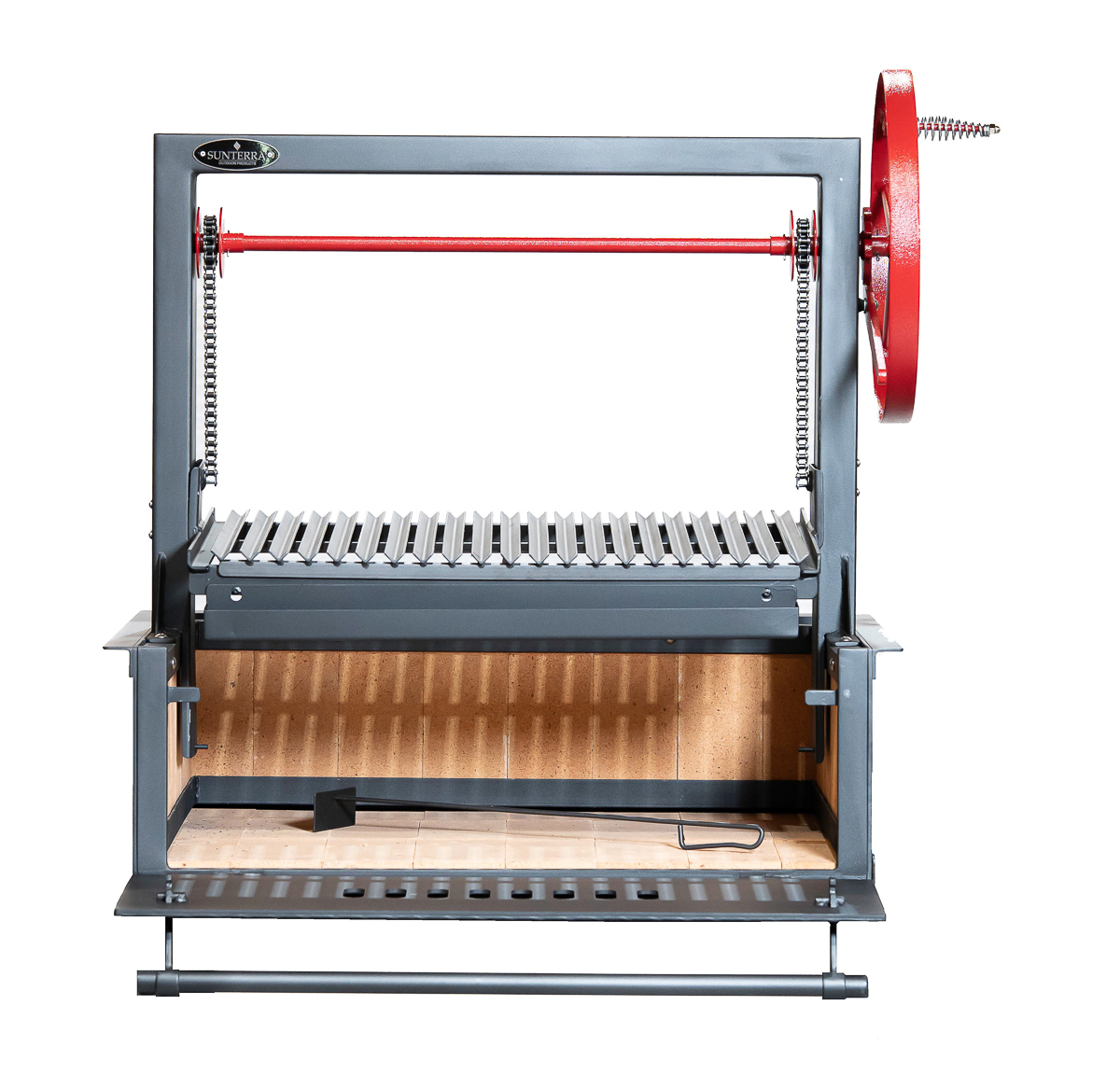 All grills now come with the door swinging down and with chain drive, instead of cables. Pictures are being updated.